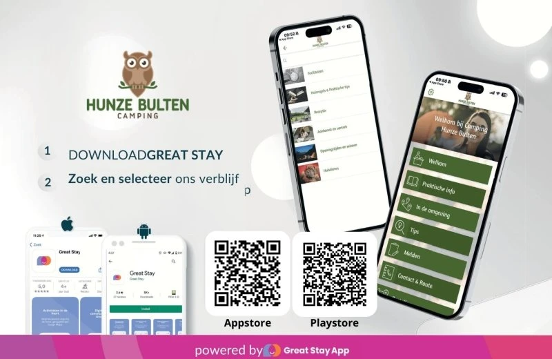 Om je verblijf op Camping Hunze Bulten zo gemakkelijk mogelijk te maken, maken we gebruik van de Great Stay app. In deze app vind je praktische informatie over de camping en inspiratie voor leuke activiteiten in de omgeving. Zo heb je alles wat je nodig hebt eenvoudig op je telefoon. Je kunt de app gebruiken om vooraf van je verblijf voor te bereiden, maar ook tijdens de vakantie is het een handige plek om snel iets op te zoeken.